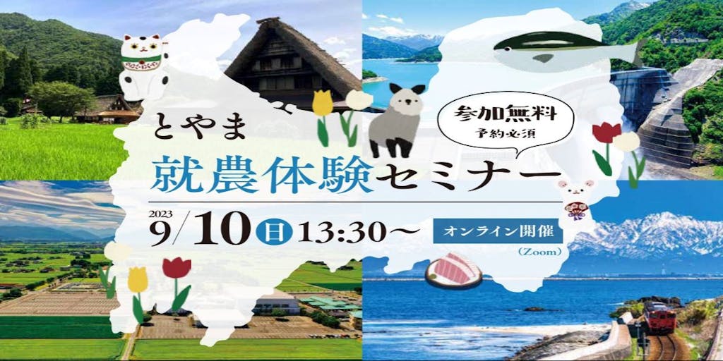2023/09/10富山県への移住・就農に興味のある方を対象に、『とやま就農体験セミナー』(オンライン形式)を開催します。 イベントでは、先輩就農者との座談会などリアルな体験談も聞くことができるチャンスです! 子育ても生活も、暮らしやすさもトップクラスの富山県で、あなたも移住や就農を検討してみませんか?
