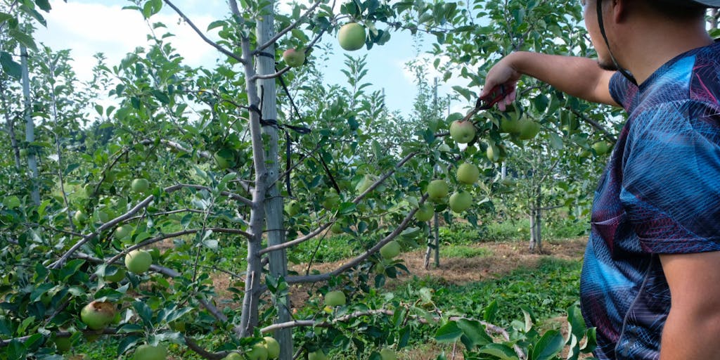 もんのすけ農園さんには樹齢70年ほどの大きなリンゴの木がありますが、古い木は病気が出やすく、摘果しても実が大きくなりづらいそうです。 圃場の歴史ある木を伐採するのはもったいないと感じてしまいますが、美味しいリンゴをつくるためには大切なことです。