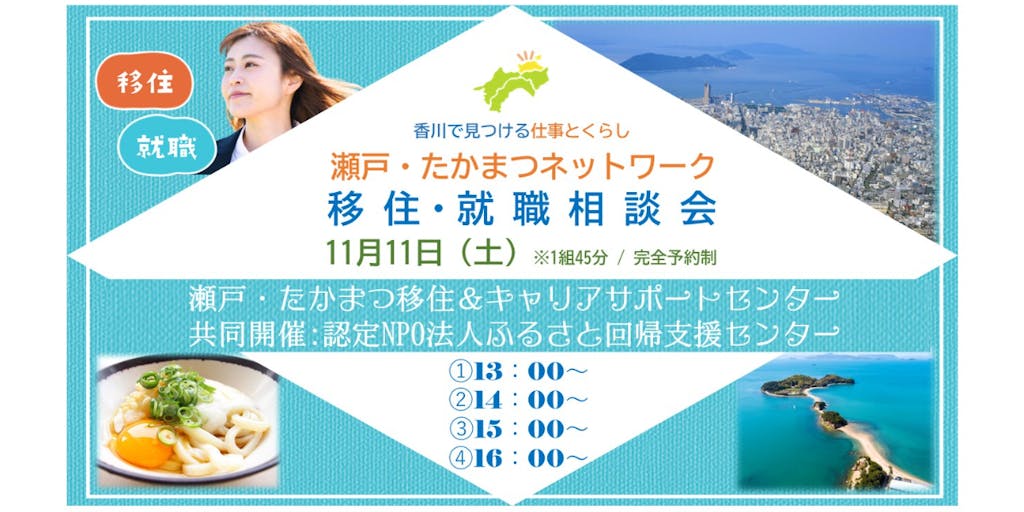 その第二弾として【ふるさと回帰支援センター】と【瀬戸・たかまつ移住&キャリアサポートセンター】が香川県への移住を検討されている皆さんに、それぞれの地域の特徴や転就職事情などについてご相談を承ります。但し、ご相談枠が4つしかございませんので、お早目のお申込みをお願い致します。