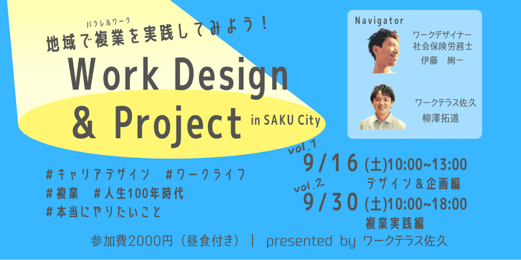 2023/09/04「Work Design & Project in SAKU Citiy」は、長野県佐久市をフィールドに、地域複業(パラレルワーク)をデザイン&実践するイベントです!佐久市や周辺市町村に移住してきた方、これから移住を検討している方。地域での新しいチャレンジをしてみませんか?