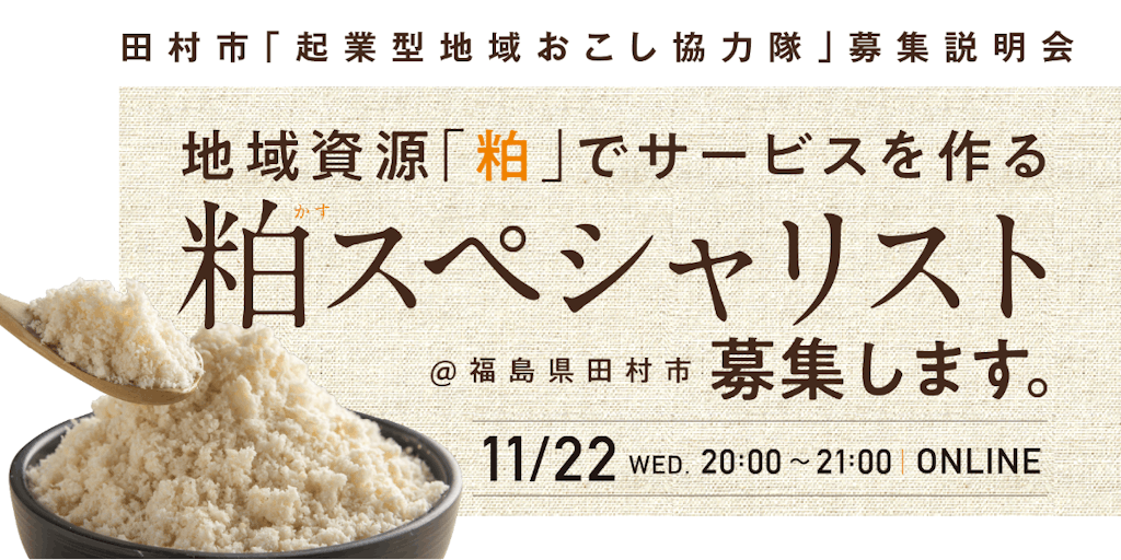 2023/11/21【募集概要】 田村市では、「粕(かす)ぺシャリスト」として、粕を利用した製品やサービスを創出し、地域活性化に貢献していただける起業型地域おこし協力隊を募集します。