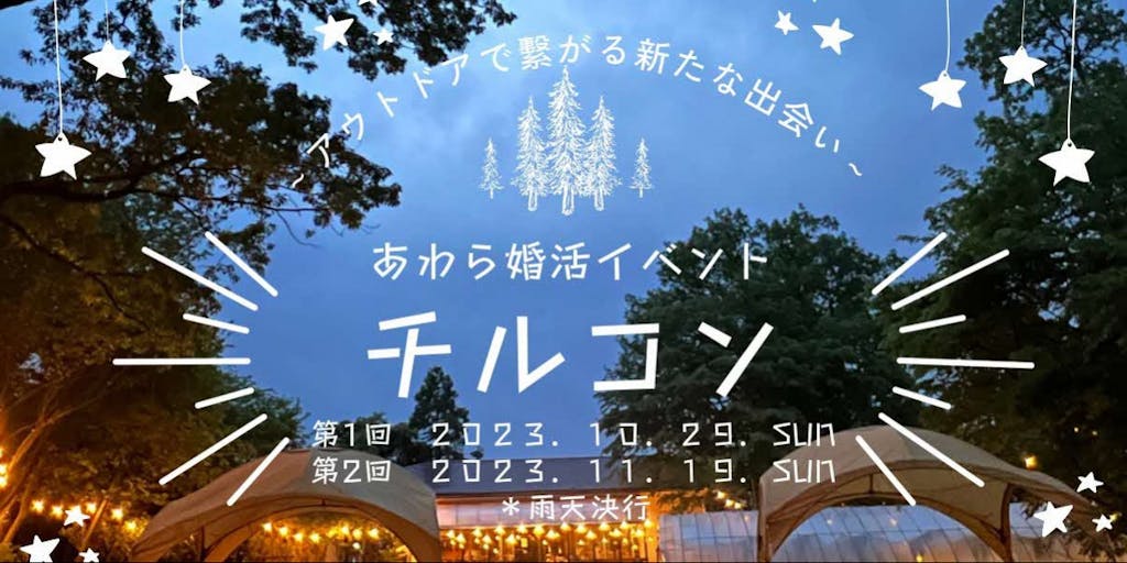 ♢とき 第1回:令和5年10月29日(日曜日)11:00〜17:30(受付10:30〜) 第2回:令和5年11月19日(日曜日)11:00〜17:30(受付10:30〜) ♢ところ 十楽の森(福井県あわら市山十楽60-3) ※ 当日は、現地に集合してください。 ♢募集年齢 第1回:令和5年10月29日(日曜日)開催 男女ともに20歳~39歳の独身の方 ※ 男性は、あわら市在住orあわら市内で勤務されている方に限る。 ※ 女性は、どなたでも大歓迎! 第2回:令和5年11月19日(日曜日)開催 男女ともに30〜49歳の独身の人 ※ 男性は、あわら市在住orあわら市内で勤務されている方に限る。 ※ 女性は、どなたでも大歓迎! ♢定員 男女各15名 計30名(応募者多数の場合先着順) ♢参加費 女性:1,000円(税込) 男性:1,500円(税込) ♢申込期限 第1回:令和5年10月29日(日曜日)開催 令和5年9月12日(火曜日)〜10月22日(日曜日) 第2回:令和5年11月19日(日曜日)開催 令和5年9月12日(火曜日)〜11月12日(日曜日) ♢申込先 あわら市のホームページから申し込みサイトに入ることができます。 https://www.city.awara.lg.jp/event-into/p012870.html