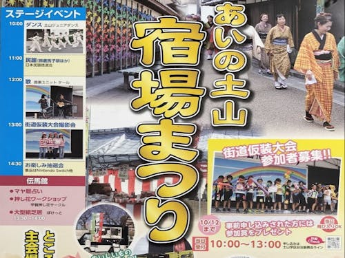 当日は地域一帯で「あいの土山 宿場まつり」が開催されています!お子様も楽しめるイベントが盛りだくさんです!地域のイベントに興味ある方もぜひ!