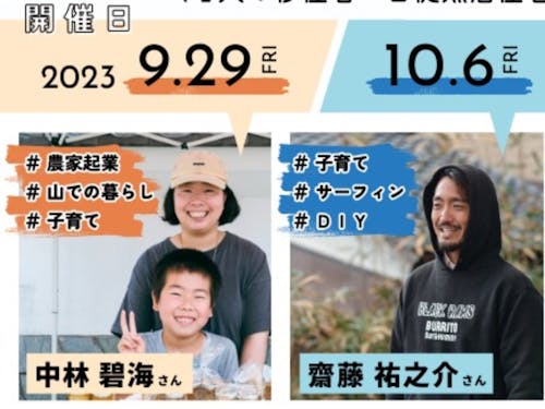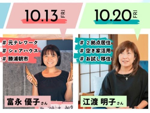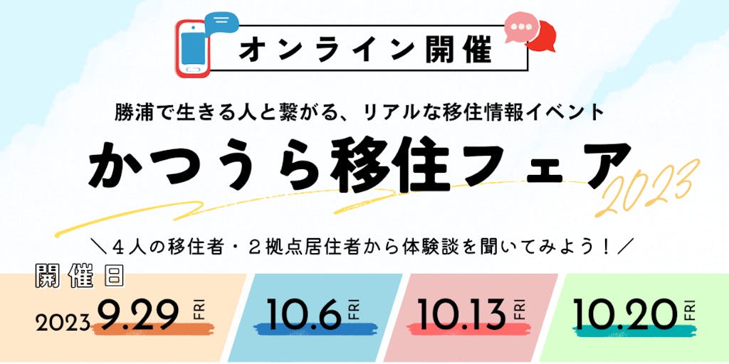 2023/10/319/29(金)から10/20(金)の毎週金曜日に4人の移住者さん・2拠点居住者さんをゲストに迎え、 一人ずつ勝浦移住の体験談を話してくれるオンラインイベントです。 「移住後の生活で大変だったことは?」「子育て環境が心配」 「夏が涼しいって本当?」など、各回ゲストがそれぞれの切り口で 実際の体験談をお話ししていただきます。