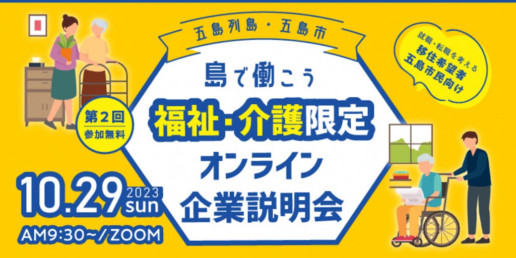 2023/10/19昨年に続き、今年も地域協働課(移住担当)と長寿介護課(福祉担当)、そして五島市内の福祉・介護団体企業5社による特別なオンライン説明会を開催します!