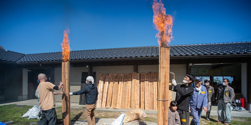 なぜ手焼きにこだわるの? 現在竹野には焼板を焼くことができる職人が少なく、全国的にも手焼きの焼杉板は入手困難な状況です。しかし、手焼きは工場で生産される既製品とは違って耐久性が高く、見直しの機運が高まっています。
