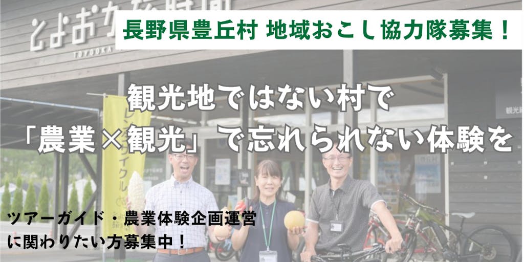 ・定員:30名 ・最小催行人数:5名 ・スケジュール: 豊丘村の地域おこし協力隊として「とよおか旅時間」と共に働く「ツアーガイド」「農業体験企画運営」の2職種の募集です。観光×農業で地域課題の解決を目指す「とよおか旅時間」と一緒に、村の魅力にどっぷりハマり、豊丘の魅力を発信する仲間を探しています。 このイベントでは記事では伝えきれない協力隊募集に対する思いをお伝えするほか、参加者の皆さんと直接お話ができる機会とさせていただきたいと考えています。