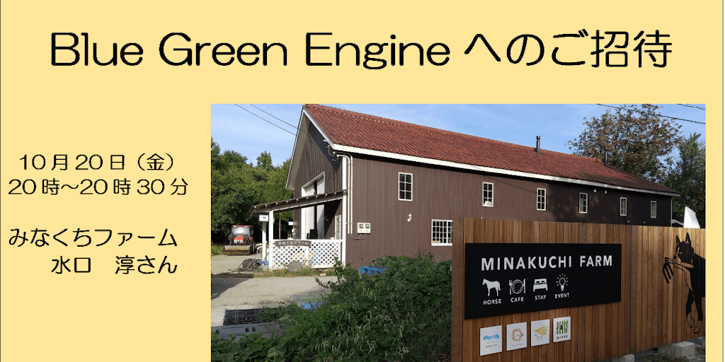 ・・・・・・・・・・・・・・・・・・・・・・・・・・・・・ 第7回 Blue Green Engine 開催日時:令和5年10月20日(金)20:00~20:30 ※参加費無料・申込不要 テーマ:「みなくちファーム」の活動について ゲスト:水口 淳さん(代表) みなくちファームサイト:https://minakuchi-farm.com/