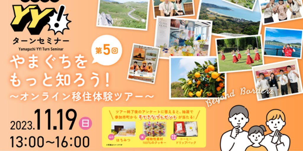 「Beyond Borders-移住で世界を広げよう-」をコンセプトとして、「やまぐち暮らし」の魅力を発見していただく「YY!ターンセミナー」。今年度の第5回目は「やまぐちをもっと知ろう!」をテーマに県内6市町をオンラインで旅し、各市町の移住担当者や移住の先輩の話を聞いて各地の魅力を感じてみませんか?! 気軽に巡るオンライン移住体験ツアー!たくさんのご参加をお待ちしております♪
