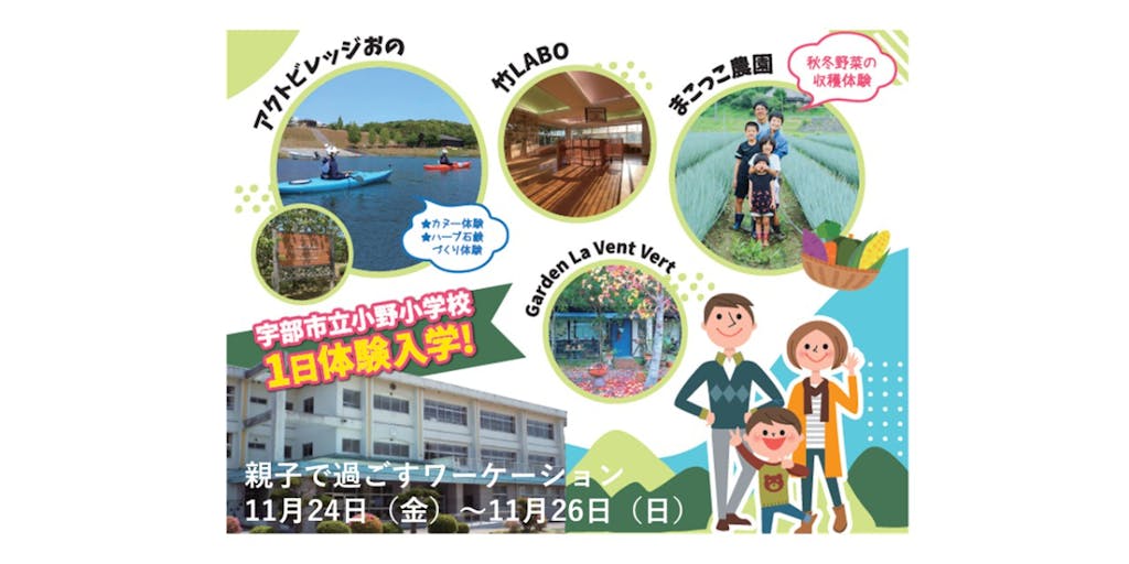 今回のツアーでは、自然豊かで便利な田舎にある小学校を体験していただきたく、親子(小学生と保護者それぞれ1名以上)で参加してくださる方を募集しています。1日目は、全校生徒21人の宇部市立小野小学校にて複式学級で授業を受けたり、地元の食材がたくさん使われた給食をみんなで食べたり、のびのびとした小学校の様子を実際に体験してもらえます。 子どもたちが1日体験入学をしている間、大人の皆さんは、ワーク時間として仕事をしていただけます。もちろん、学校見学をしていただくことも可能です。小野エリアには、親子が学び、楽しめる施設が沢山あります。また、地域の方々の受入れ体制も充実しているのも小野エリアの魅力です。夜は、地域の方との交流会で皆さんと仲良くなれます。