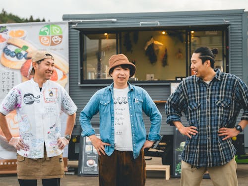 ※画像は「福島県田村市キッチンカー移住チャレンジ」より誕生した田村市発の3台のキッチンカー 竹前さん(左)、近藤さん(中)、渡邉さん(右)