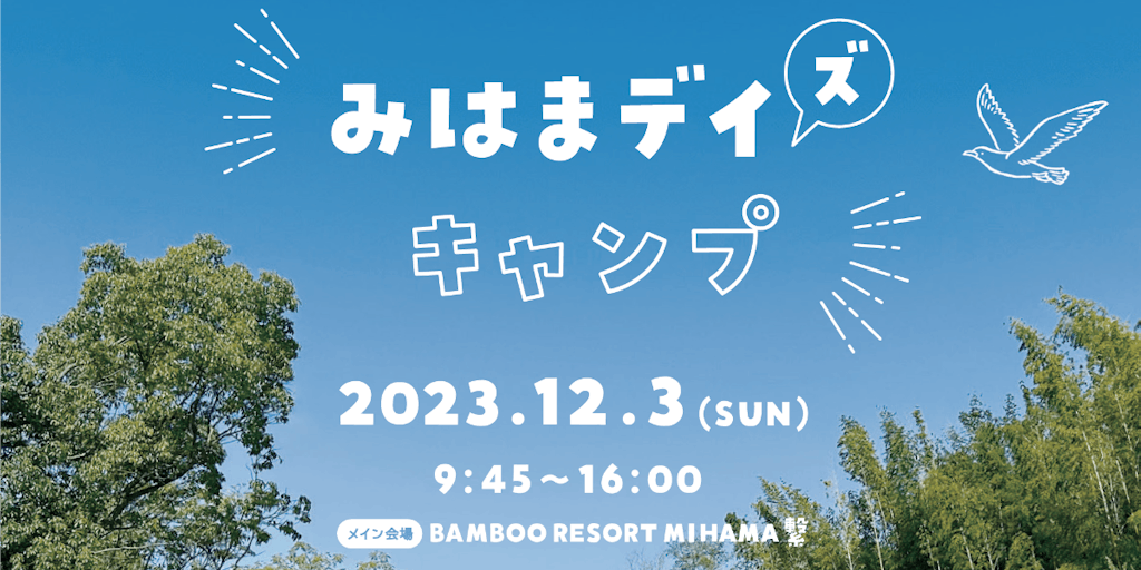 ・定員:30名 ・最小催行人数:4名 ・解散場所:現地解散 ・スケジュール: ①午前の部「美浜ぐるっとガイドツアー」 【日程】12/3(日) 9:45~13:00 【プログラム】 9:45 受付開始 10:00 挨拶 10:15 ガイドツアー 町のみどころをご紹介します! 11:45 BAMBOO RESORT MIHAMA 繋に集合 12:00 ランチ交流会 ~先輩移住者、地元民に相談してみよう!~