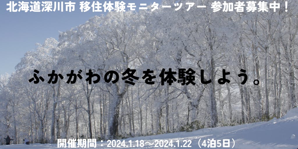 札幌市と旭川市の間にある田園風景が広がる深川市。のんびりとした空気が流れ周辺地域へのアクセスが良く、ほどよい田舎で暮らしやすいまちです。 そんな深川市ですが、まだまだ知名度は低く「深川市ってどこにあるの?」と聞かれることもしょっちゅう。 移住を検討している方へ深川市の魅力を伝えたい、もっともっと深川市のことを知ってもらいたい!!さらに冬の暮らしを体験いただきたいという思いから4泊5日のモニターツアー冬を開催いたします!