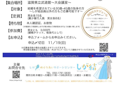 結婚を希望されている30歳~45歳までの独身男女の方 ※しが結会員以外の方もご応募可能です!