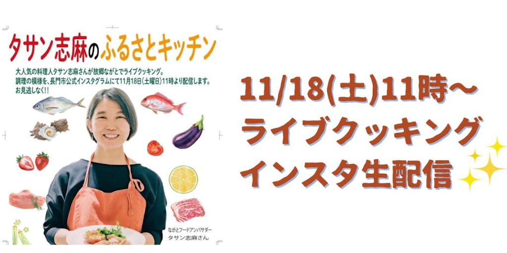 11/18(土)11時〜長門市役所公式Instagramにてタサン志麻さんのライブクッキングの様子を生配信します。