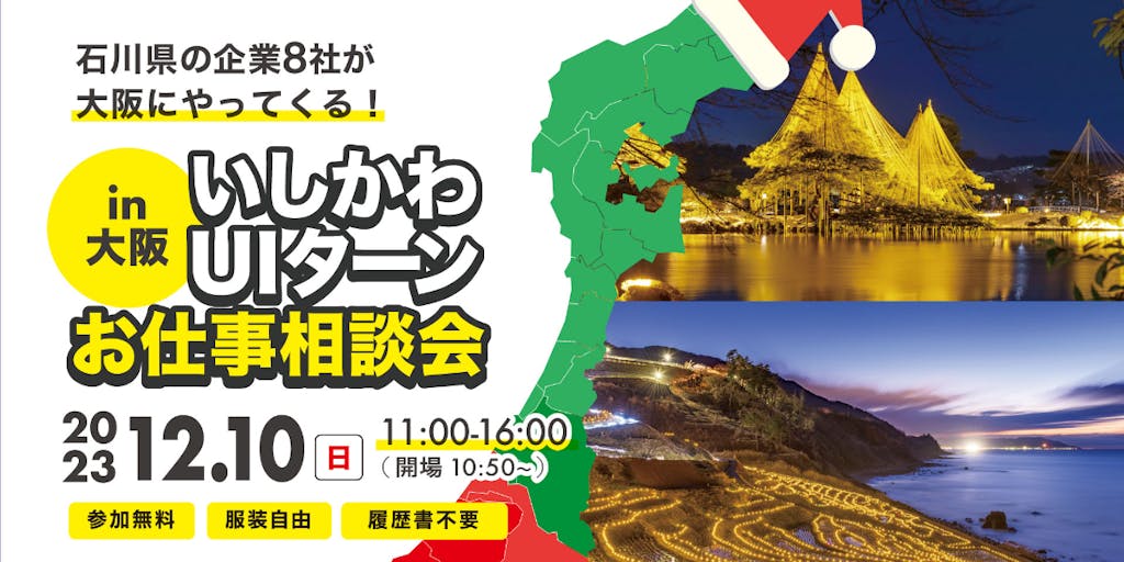 ☆一度に複数の企業と出会える ☆人事担当者と直接話せる ☆履歴書不要 ☆服装自由 ☆社会人も学生も歓迎♪ ☆「いしかわUIターン大相談会in大阪」同時開催
