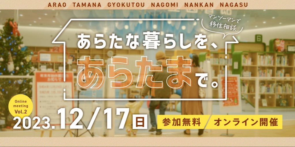 2023/12/14移住しようと考えているけど、自然に囲まれた暮らしとか、食べ物がおいしいとかってどこも一緒でしょ? 「いいえ!違います。」 あらたま地域は特に、 ・ 海も山も川も、自然も身近に感じられ、温泉もたくさん。 ・ 季節のおいしい農産物も豊富。 ・ 新幹線や高速道路など交通アクセスも便利。 ・ 大きなテーマパークも小さな公園も充実。 ・ 子育てや医療体制も安心。など 都市の便利さも田舎の豊かさも感じられる、あらたま地域の2市4町が、あなたの希望に応えます。今回は、そんなあらたま地域の移住定住担当職員とマンツーマンでお話ができる、オンライン移住相談会を開催します。