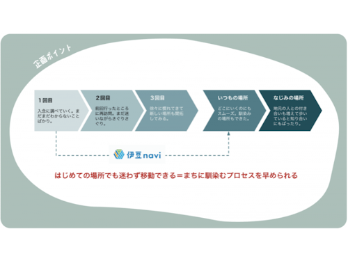 ◆まちに馴染むワーケーションって? 「伊豆navi」を使うことで、地元の観光飲食情報や、カーシェアやレンタサイクル等の交通手段の情報が入手できるため、はじめての土地での目的地探しやそこまでの移動がスムーズになります。 これまで何度も訪れないと知ることができなかった情報をデジタルサービスを通じて容易に入手できるようになることで、まちにより馴染みやすく、愛着をもってもらえるスピードを高める効果があると考えています。
