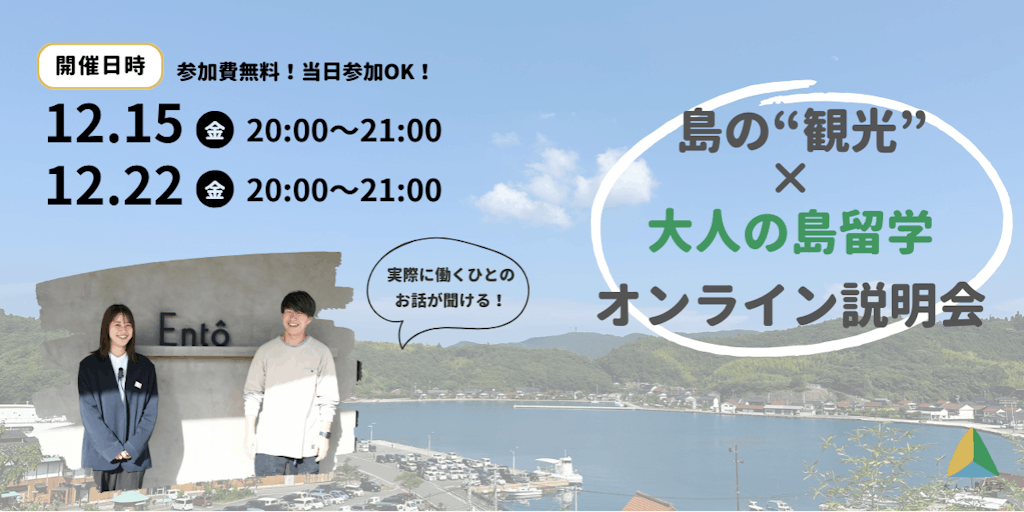 ■参加方法: ① 「応募したい」ボタンを押していただいた上で、下記フォームよりお申し込みください。 https://forms.gle/URsW8ReD4frKvWr8A ②受付確認後、大人の島留学運営事務局より、当日のzoomリンク等をお知らせいたします。