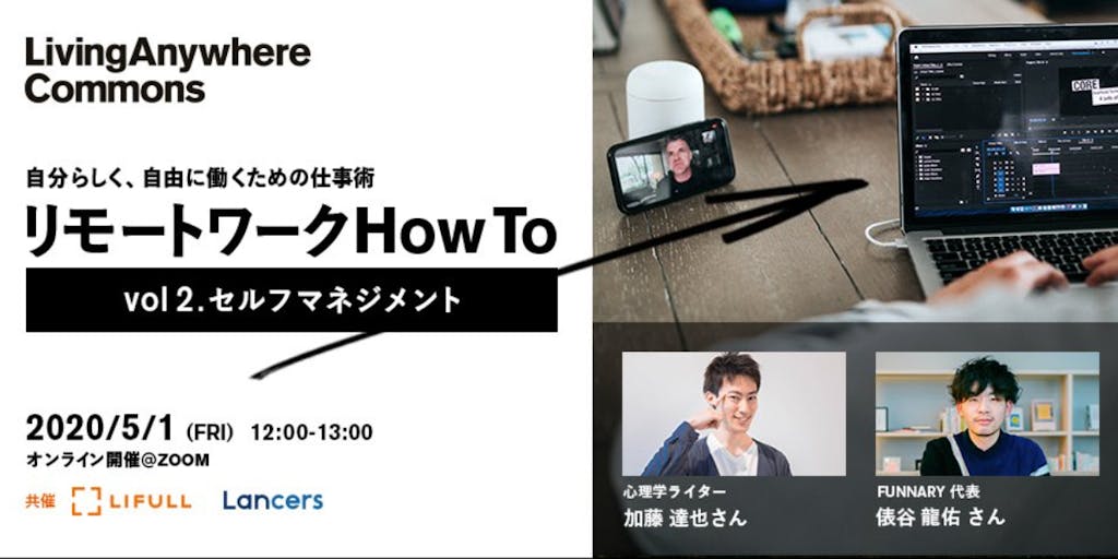 在宅でも「自分らしくを、もっと自由に。」を共創し、実践しよう。 共創型コミュニティ『LivingAnywhere Commons』と、日本最大級のお仕事マッチングプラットフォームを運営するランサーズのコラボイベント!