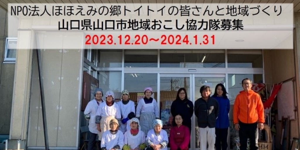 ■募集人員 1名 ■勤務地 NPO法人ほほえみの郷トイトイ(山口市阿東地福上1886-1) ■勤務日数 月、火、木、金曜日(週4日) ■勤務時間 午前6時30分~午後3時15分(7時間45分) 午前7時30分~午後4時15分(7時間45分) ※いずれかから選択。自身の都合にも応相談 ■休日 平日のうち1日、国民の祝日に関する法律に規定する休日、年末年始(12月29日~1月3日) ※時間外、休日の勤務は、週勤務時間(31時間)内で調整することとします。 ■雇用形態 山口市の会計年度任用職員(パートタイム・兼業可)として雇用 ■雇用期間 令和6年3月以降の可能日~令和6年3月31日 ※着任日については、応相談 ※着任日が令和6年4月1日以降の場合、雇用期間は着任日~令和7月3月31日。 ※勤務成績、態度、能力等により最長3年まで更新可能です。 ■給与 月額 176,800円 期末手当 報酬月額の2.4か月分(6月期・12月期 それぞれ1.2か月)を支給 ただし、在職期間に応じて所定の割合を乗じた額を支給 ■待遇・福利厚生 (1)厚生年金、健康保険及び雇用保険に加入します。 (2)活動期間中は市からの活動支援業務を受託する中間支援団体が用意する住居で生活してください。その際、居住の家賃はこちらで全額負担しますが、光熱費やCATV加入金・利用料等は本人負担とします。 (3)業務に必要な備品及び消耗品は予算の範囲内において中間支援団体が用意します。 (4)業務に使用する車両は中間支援団体が用意します。 (5)本市への定住支援として、各種補助金の交付を受けることができます。(一部自己負担あり。詳細は下記URLからご確認ください。) 【地域おこし協力隊に関する要綱】 Https://http://www.city.yamaguchi.lg.jp/soshiki/26/150824.html