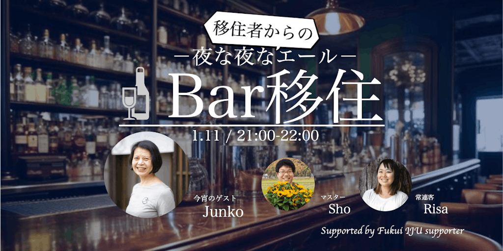 2024/01/11移住のあれこれについて、テーマだけを決めて、ゆるりと話す夜。 それが【Bar移住〜夜な夜な移住者からのエール〜】 今回のトークテーマは「引越し16回のIターン移住者が語る!若狭小浜の自然と人と私の暮らし」