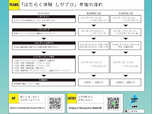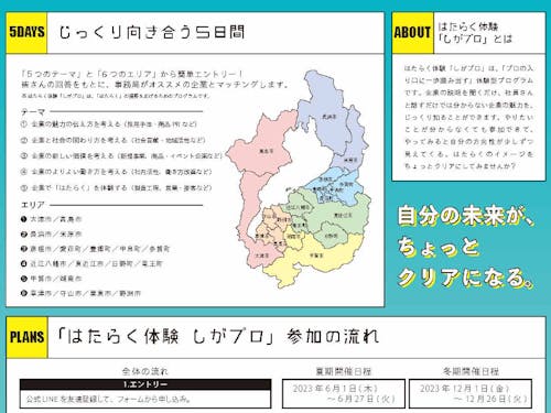 ※「はたらく体験 しがプロ」は、”はたらく”視野を広げるためのインターンシップ・就業体験です。体験内容・実習企業はお選びいただけません。