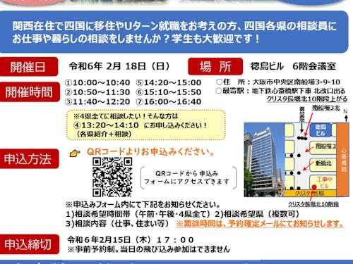 2024/02/15高知、徳島、香川、愛媛の四国4県大阪事務所の共催により、「四国移住・就職相談会 in 大阪」を開催します!