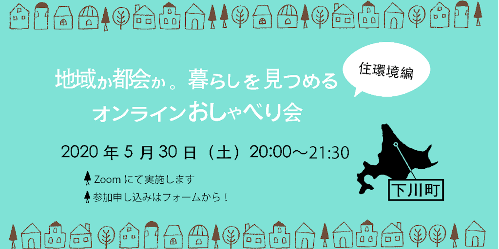 ◆タイムスケジュール ・イベントのイントロ(チャット内で質問を書きこんでください) ・まずは簡単に下川町をご紹介 ・住宅を購入した2名の方の事例を紹介 ・グループワーク「コロナ禍で気づいた住環境への不安、不満、暮らしに対して考えていること」 ・グループワーク「理想の住環境とは」 ・下川町の住宅事情に対して皆さんからの質問に回答 ・ネクストステップの紹介 ・エンディング ◆開催日時 ・開催日:5月30日(土) ・開催時間:20:00~21:30 ◆使うツール ・Zoomを利用します。 ◆参加方法 peatixよりお申込み (上記より参加申し込みをされた方に、個別にURLをご連絡いたします) ◆問い合わせ先 下川町産業活性化支援機構タウンプロモーション推進部