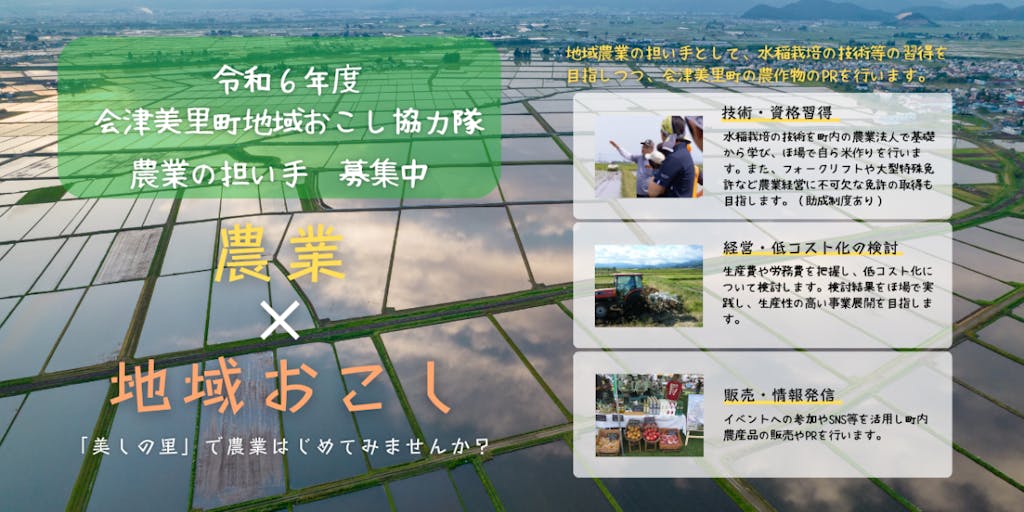 2024/02/29福島県会津美里町では、基幹産業である農業を維持し、広大な農地を将来にわたり適正に管理していくため、水稲栽培の担い手として活動し、会津美里町産農作物のPRをしてくださる「地域おこし協力隊」を募集します!!