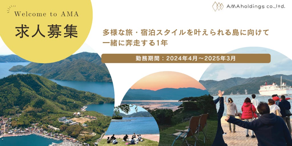 離島である海士町には、観光客だけでなく関係人口や視察、研修、工事関係者など多くの人が年間を通して来島します。 ですが、近年、宿泊施設が足りないことが島の課題になっています。 そこで、AMAホールディングス株式会社は、より魅力的な滞在のかたちをつくる新たな事業を立ち上げます! 「旅・宿泊魅力化プロジェクト」では、多様なライフスタイル、旅のスタイルに合わせて自由に滞在できる空間づくりを ” 新規事業 “ として一緒に進めてくださる方を募集します。