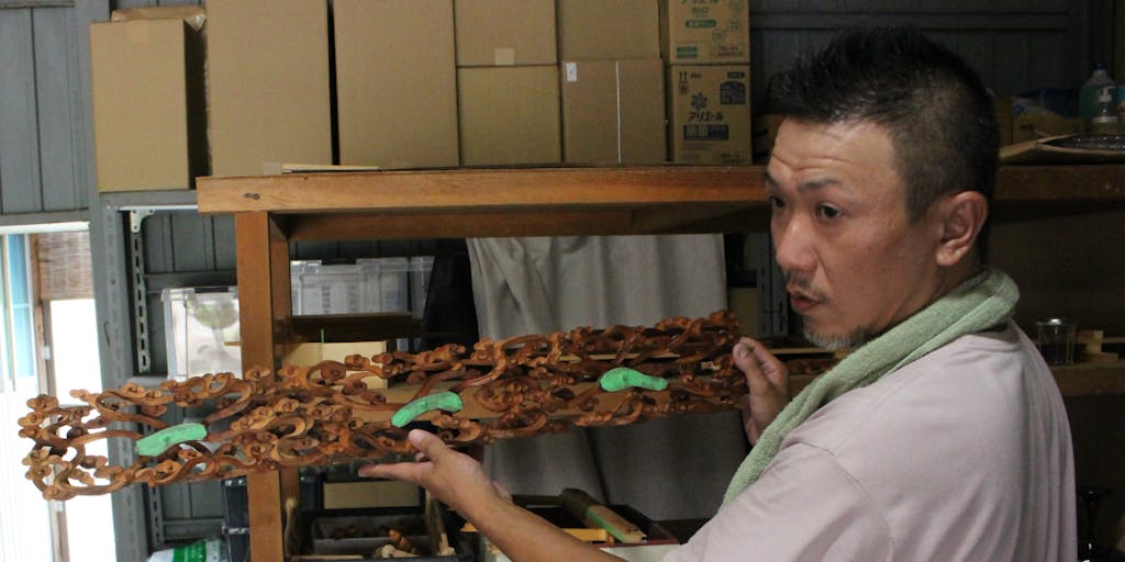 2024/10/31滋賀県甲良町北落区の犬上川の川畔、令和3年に両親が営まれていた荒木仏壇へ戻り 「ArkPaint(アークペイント)」を立ち上げ、伝統産業の仏壇づくりにこだわり ながら、新たな作品の創作にも挑戦されています。趣味で育てるメダカは、所狭しと種類と数を増やし、近所の子どもたちが楽しみにやってくるんだと目を細めていました。 [どうして職人に] 約40年前に父と母が夫婦で荒木仏壇を創業し、両親の背中を見る中で仏壇づくりに憧れ 彦根の仏壇屋で修業を積みました。修業先の仕事は順調で社長にも気に入られ 約20年間お世話になり「塗師」の仕事をみっちり教え込んで頂きました。 仏壇は「木地師・宮殿師・彫刻師・塗師・金箔押師・蒔絵師・錺金具師」の7人の職人の 手により作られますが、中でも「塗師」は最も重要な工程の一つで天然の材木を使用するため、細心の注意を払いながら根気強く幾重にも塗の工程を繰り返します。