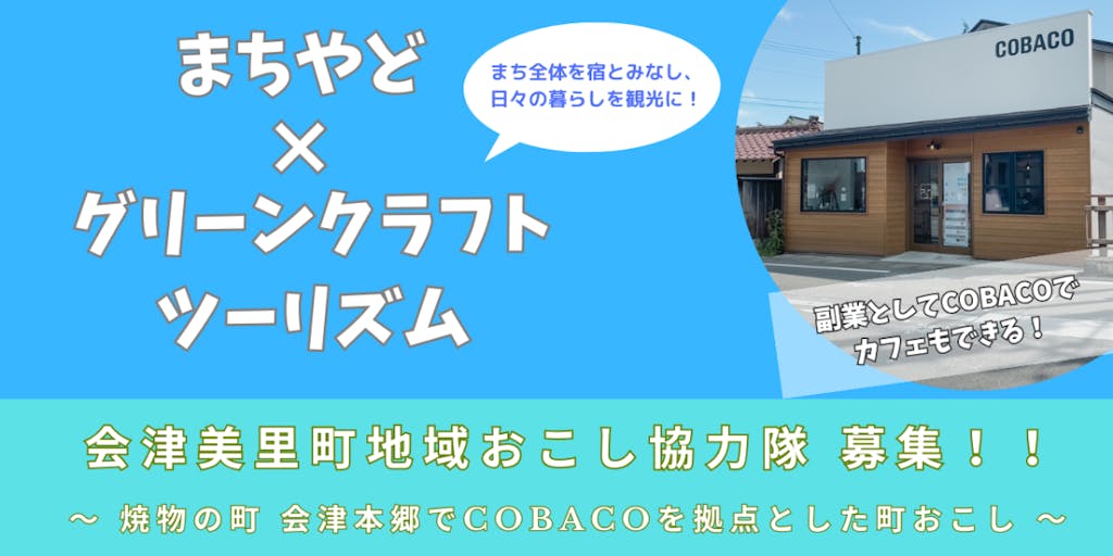 会津美里町では、平成30年度より町全体まちを一つの宿と見立て、宿泊施設と地域の日常をネットワークさせ、まちぐるみで宿泊客をもてなすことで地域価値を向上させる「まちやど事業」と地域特性をコンテンツとする新しい滞在型観光「グリーンクラフトツーリズム」を推進してきました。 そして令和5年4月に「まちやど事業」の拠点として、古くから町民に親しまれたたばこ店を改装し、レンタルスペース、レンタルキッチン、カフェ、アクセサリーショップが集う複合施設と生まれ変わった「COBACO」が旧会津本郷町の会津本郷地域 瀬戸町に誕生し、より一層「まちやど事業」の推進に力を入れていきたいと考えております。また今後、トゥクトゥクやEバイクなどのモビリティを活かした新たな滞在型観光によるインバウンドの集客も考えています。 会津本郷地域は、東北最古400年以上の歴史をもつ会津本郷焼の産地として最盛期には100を超える窯元があったとされ、現在も個性豊かな焼物を作る12の窯元があり、「COBACO」が位置する瀬戸町メインストリートの昭和の町並みを残した趣深い雰囲気も魅力です。 そんな会津本郷地域で「COBACO」を拠点とした「まちやど事業」と「グリーンクラフトツーリズム」の推進を担う地域おこし協力隊を募集します。