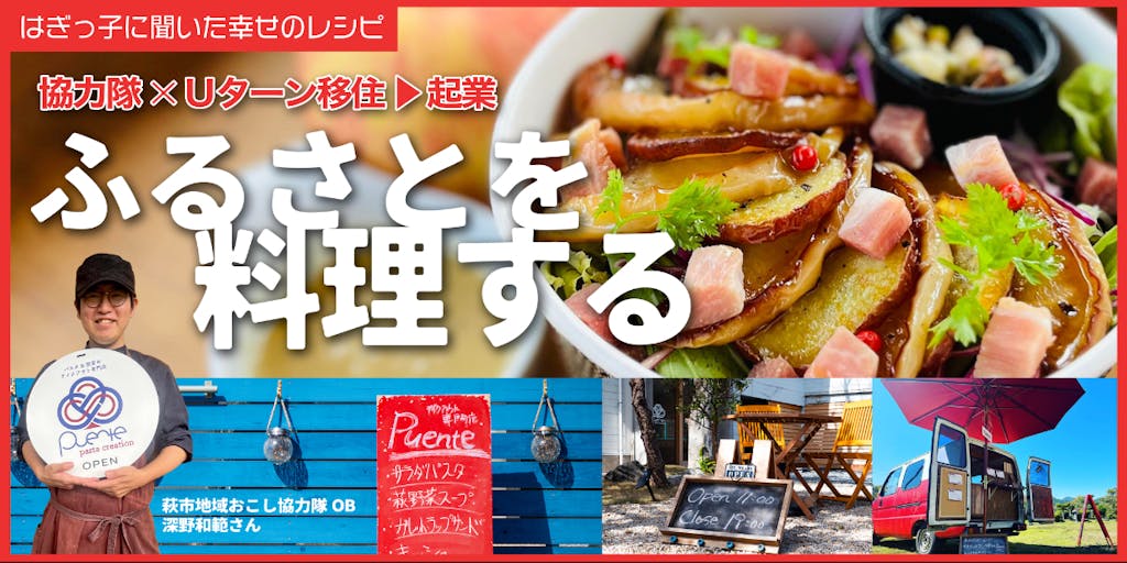 【深野和範(ふかの かずのり)さん】 1983年、山口県萩市生まれ。高校まで萩市で育ち、18歳で山口市の調理師専門学校へ。 卒業後は鎌倉→宇部と料理を中心に12年間経験を積んで、萩市へ帰郷。 2015年9月から萩市地域おこし協力隊として着任し、料理の腕を活かして地元食材を使った加工品開発、イベントへの出店、お祭りに参加するなど地域との交流を深めながら、3年間活動した。 卒隊後は実家の1階を改装してパスタ&惣菜のテイクアウト専門店『Puente』をオープン。 ふだんはお店、時にはキッチンカーでイベント出店しながら、萩の食材を活かしたお洒落でおいしい料理を提供している。 =・=・=・=・=・=・=・=・=・=・=・=・=・=・=・=・=・=・=・=・=・=・=・=・=・=・=・=
