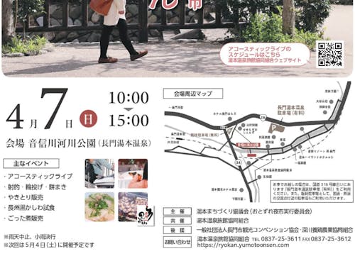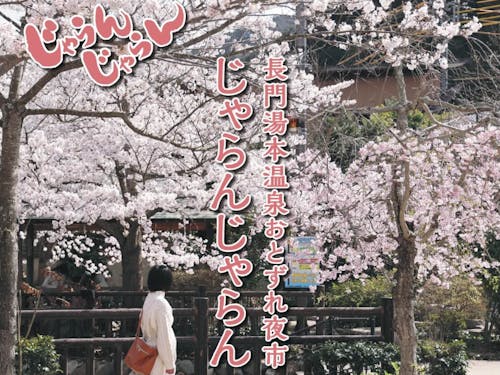 「じゃらんじゃらん 長門湯本温泉おとずれ夜市」 日時:4月7日(日)10-15時 主なイベント:アコースティックライブ、縁日、屋台、長門名物やきとり販売、他 場所:音信川河川公園(長門湯本温泉)