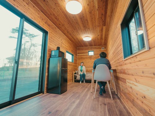 2023 年に完成したばかりのトレーラーハウス mocca。内装は田村市産のブランド杉を使用。杉材の包み込むような柔らかさと、味わいが感じられる移住検討者向けの宿泊施設です。