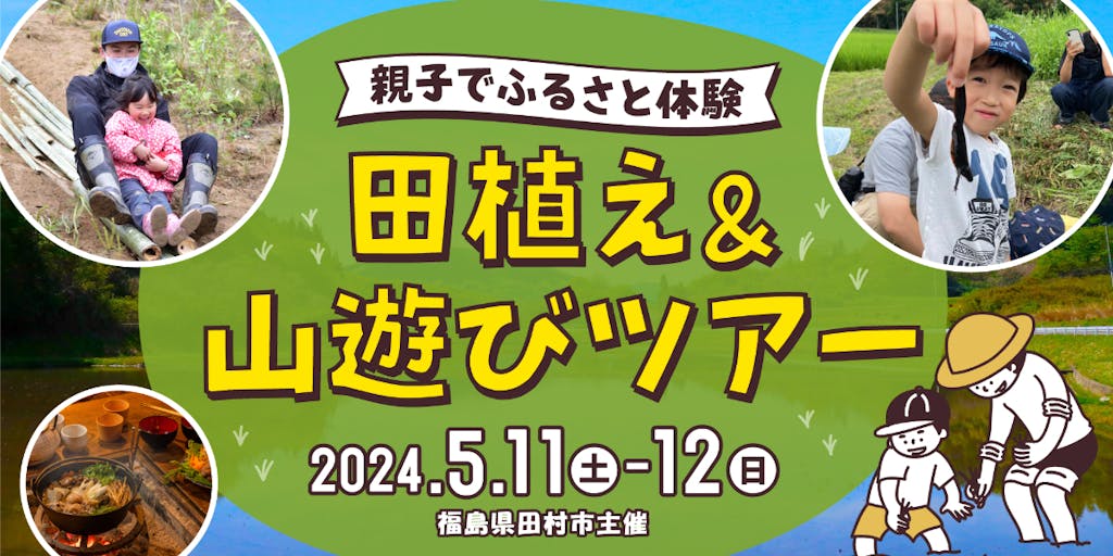 ■プログラム内容 <1日目> 09:10 郡山駅集合 09:55 自己紹介&オリエンテーション(田村市の概要説明) 10:50 着替え 11:50 昼食 13:00 田植え体験 15:30 看板製作ワークショップ 17:40 チェックイン&着替え&フリータイム 19:00 夕食&移住者家族と懇親会 21:00 解散 <2日目> 09:30 チェックアウト 10:00 地元住民と一緒に山遊び(もりのび参加) 12:30 昼食&移住者家族と交流 13:40 コーヒーブレイク&ツアーの振り返り 15:00 屋内遊び場(おひさまドーム)で遊ぶ 16:40 郡山駅解散 ※荒天時など諸事情によりプログラム内容が変更となる場合がございます。 ※詳細スケジュールは、申込締切後、参加確定したご家族にご案内いたします。