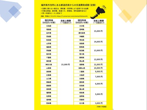 〇助成内容 ★交通費:居住元と福井県内の滞在拠点との移動にかかる交通費、勤務先への出社など一時離県にかかる費用の一部。※金額は申請者の居住地や勤務先の所在地などによって異なり、1回3000円~1万5000円。※滞在日数により、回数制限あり。 ★滞在費:県内での滞在日数に応じて日額1000円