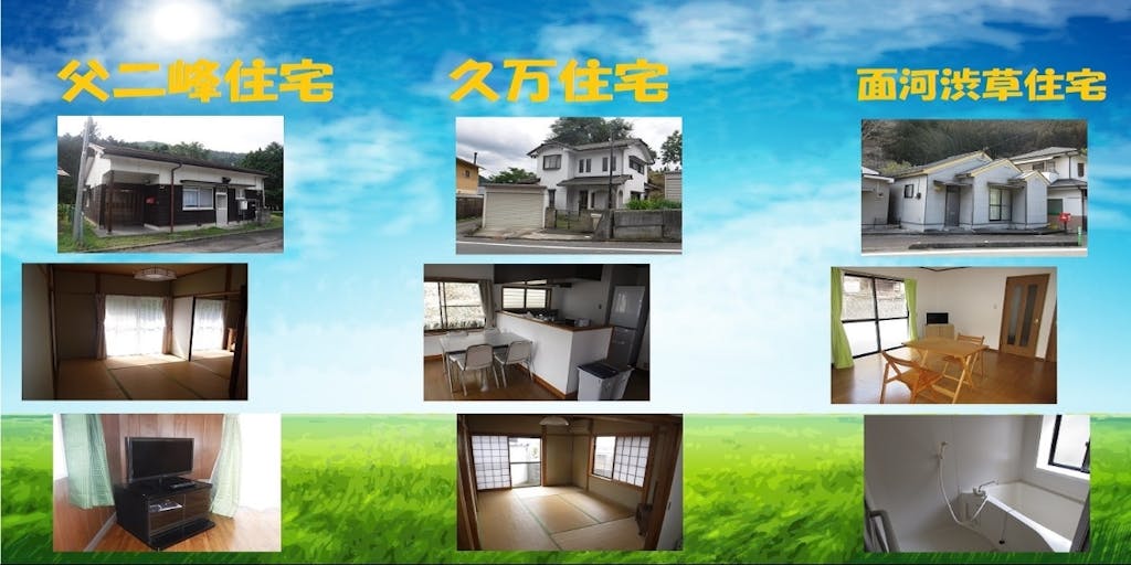 住居の契約をし、久万高原町へ引っ越してきたはいいものの、周囲の環境が思っていたのと違う・・・。そんなことになってしまっては、せっかくの移住プランも無駄になってしまいます。そこで、久万高原町では移住をお考えの方を対象に、生活を体験していただくための住居『お試し住宅』をご用意しております。 豊かな自然が体験できる露峰地区の「父二峰住宅」や渋草地区の「面河渋草住宅」に、 久万高原町の中心部に位置し利便性の高い入野地区の「入野住宅」の3棟から、ご希望の住宅を選んでお申し込みください。利用期間は最長3カ月。利用料金は住宅の利用料月額1万円+光熱水費(基本料超過分)となります。
