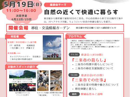 2024/05/19「地方で暮らしてみたい。」「暮らす場所を変えてみたい。」など、移住を考えている方に向けて、三条市での暮らしや仕事について紹介するイベントを開催します。