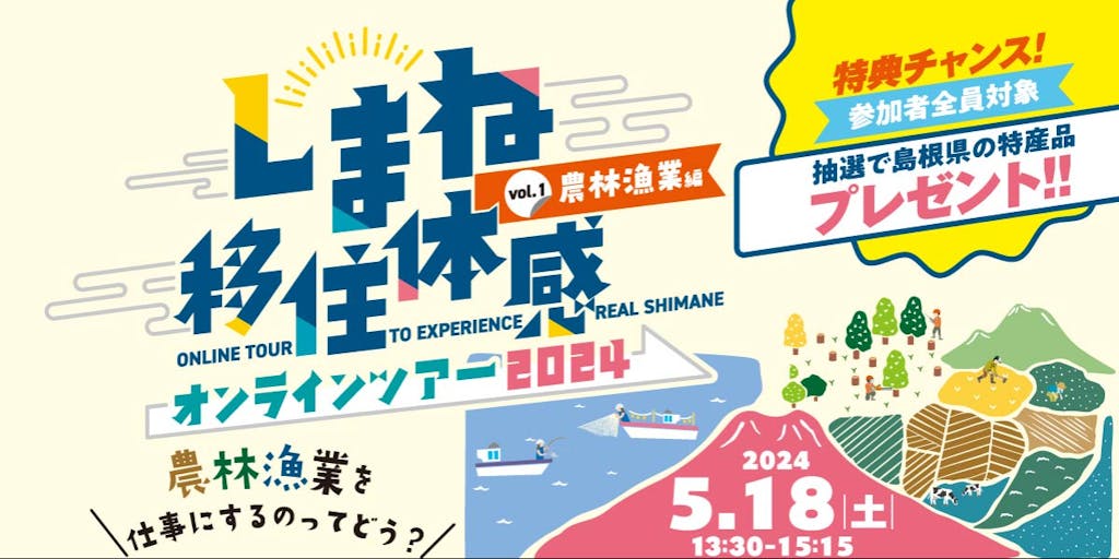 日時:5月18日(土)13:30〜15:15(希望者には延長戦あり) 方法:Zoom(お申込者には事前にURLをご案内します) 内容: 先輩移住者トーク 島根県独自の支援制度紹介 市町村プレゼンテーション(雲南市・川本町・海士町) みんなの疑問に答える質問タイム等 申込締切:5月8日(水)(1次締切) 5月17日(金)(最終締切) ※最終締切お申込みの場合、当日までに事前資料が届かないことがありますので、ご了承ください。 詳細・お申込み:特設サイトにてご確認ください。