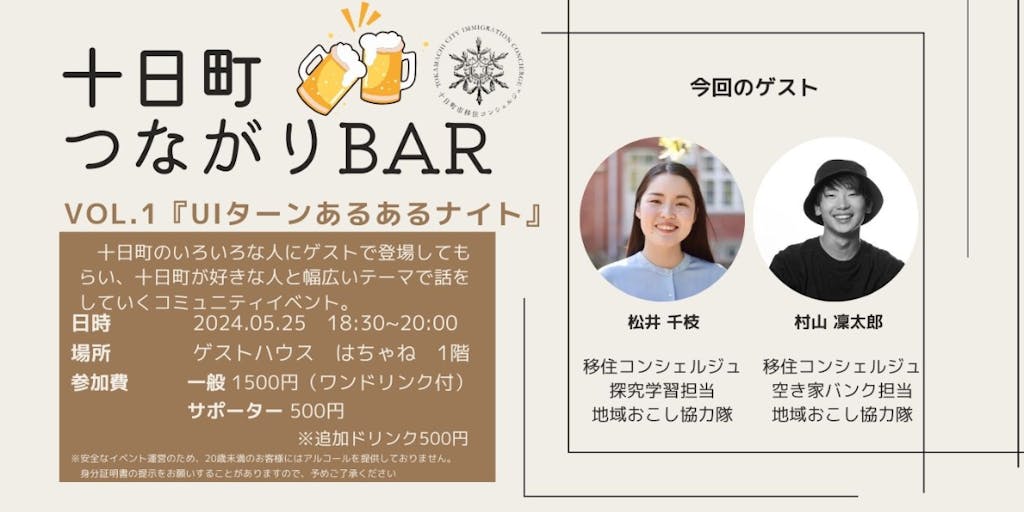 ・定員:15名 ・最小催行人数:8名 ・解散場所:ゲストハウス はちゃね1F ・スケジュール: ■タイムスケジュール 18:15~ 会場受付 開始 18:30~ オープニング 18:45~ ゲスト トーク『UIターンあるあるナイト』 ゲスト:松井千枝、村山凜太郎 19:15~ 質問タイム 19:30~ フリータイム 19:55~ エンディング 20:00~ イベント終了