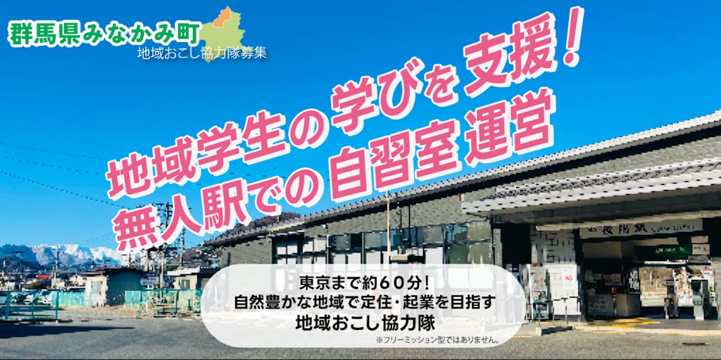 群馬県みなかみ町は、東京から約60分で日本トップクラスの自然と出会える、好アクセスの地域です。 当町の地域おこし協力隊は、すべて地域団体に配属されるミッション型です。 地域での活動が明確で、所属団体のサポートのもと動けるので地域への定着がスムーズなのが特徴です。 現在、みなかみ町の移住支援を中心とした町の活性に取り組む、当団体FLAPでも地域おこし協力隊の受け入れを行なっています。 活動領域は、当団体で運営する地域の学生たちが自主学習を行う、無人駅の学習室運営の担当隊員を募集しています。