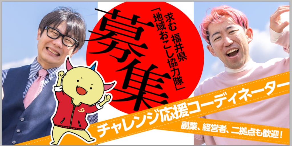 そこで、今回募集するチャレンジ応援コーディネーターには、CODが現在行っている業務を補佐しながら、自らもデザインや発信の分野で積極的に若者たちをつなげ、盛り上げていただきたいと考えています。 多くの人を巻き込みながら福井を盛り上げたい。そんな方からの応募をお待ちしています!