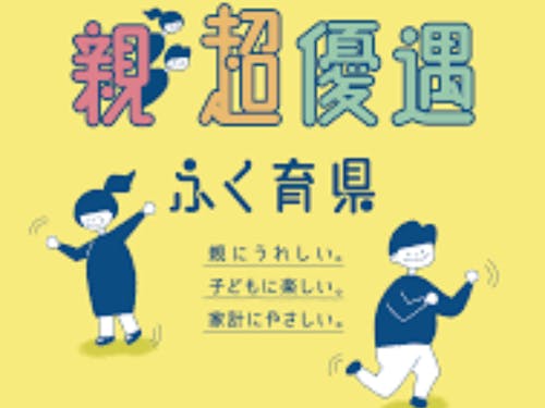 ■ここがすごい!ふく育県 ・子育て世帯等に割引・優待パスポート&クーポンを発行! ・すべての中学校3年生までの子ども医療費が無料! ・2人目以降の子どもの保育料や、一時預かり等が無料! ・子どもの遊び場が充実!