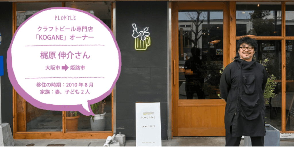 ●移住したきっかけを教えてください。 A.高齢の両親のことを考えて実家から近い姫路へJターンしました。自宅に建設事務所を構え、コワーキングスペース事業を始め、「大手前通りエリア魅力向上推進事業」にコンサルタントとして参加。「大手前通り」を活性化させるために、店舗の誘致や沿道の活用法などを提案。自身も、2022年にクラフトビール専門店「KOGANE」をオープンしました。