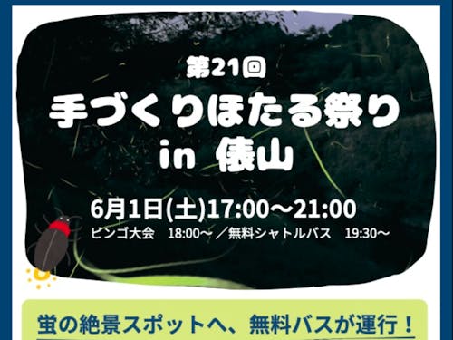 ①「第21回手づくりほたる祭り in 俵山(2024)」 日時:6/1(土)17時〜21時 会場:頭振川みどりの砂防公園駐車場(俵山ヤマネスタジアム下駐車場) ホタル観察会場:七重川河川公園(19:30〜21:00無料送迎バスが運行) 駐車場:俵山ヤマネスタジアム(長門市俵山11356) 詳細HP:https://nanavi.jp/events/hotarumatsuri_tawarayama/