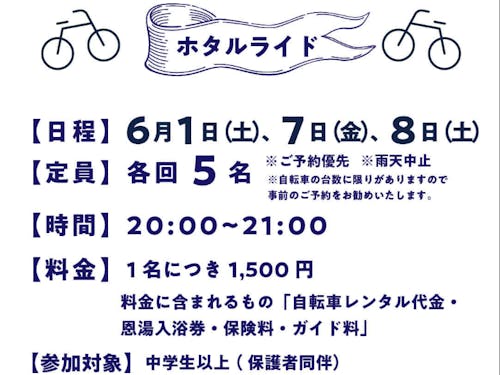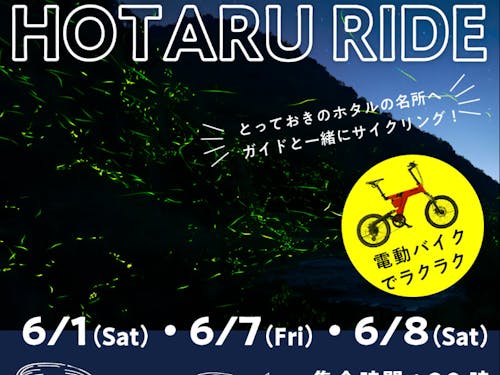 【ホタルライド】 日程:6月1日(土)、7日(金)、8日(土) 定員:各回5名 時間:20時〜21時 料金:1500円 詳細HP:https://yumotoonsen.com/events/hotaruride2024/