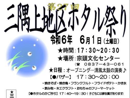 ②「第27回三隅上地区ホタル祭り(2024)」 日時:6/1(土)17時30分〜20時30分 会場:三隅宗頭文化センター ホタル観察会場:樅の木橋周辺 駐車場:宗頭幼稚園グランド(長門市三隅上3228-1) 詳細HP:https://nanavi.jp/events/hotarumatsuri_misumikami/