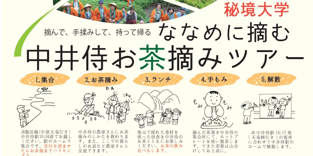 今回は、NPO法人ツメモガキで毎年開催する「ななめに摘む 中井侍お茶摘みツアー」と秘境大学のタイアッププログラムです。 移住・定住等を検討される方向けに、SMOUT利用者限定の価格で募集します。 お申し込みを希望される方は、「応募したい」ボタンを押してください。 メッセージから申し込みのご案内をいたします。 ※SMOUT以外からのお申し込みは受付できません。